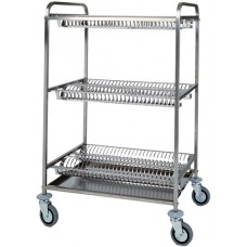 Châssis tubulaire en acier inox. Étagères à grilles en acier inox pour assiettes. Bac égouttoir à verres en acier inox. Cuvette d’égouttage en acier inox. Roulettes pivotantes.