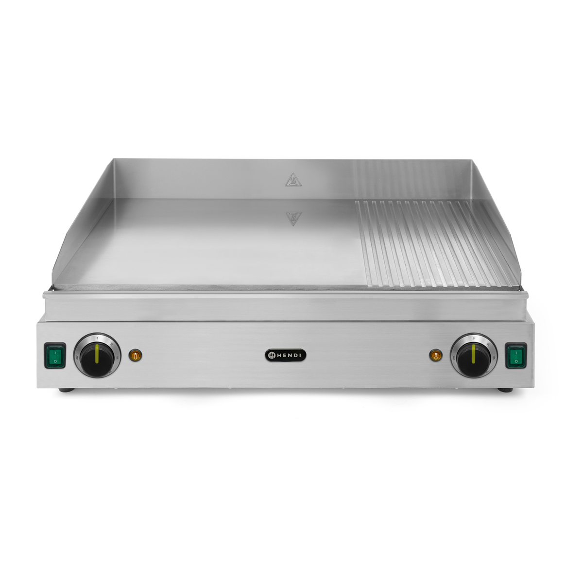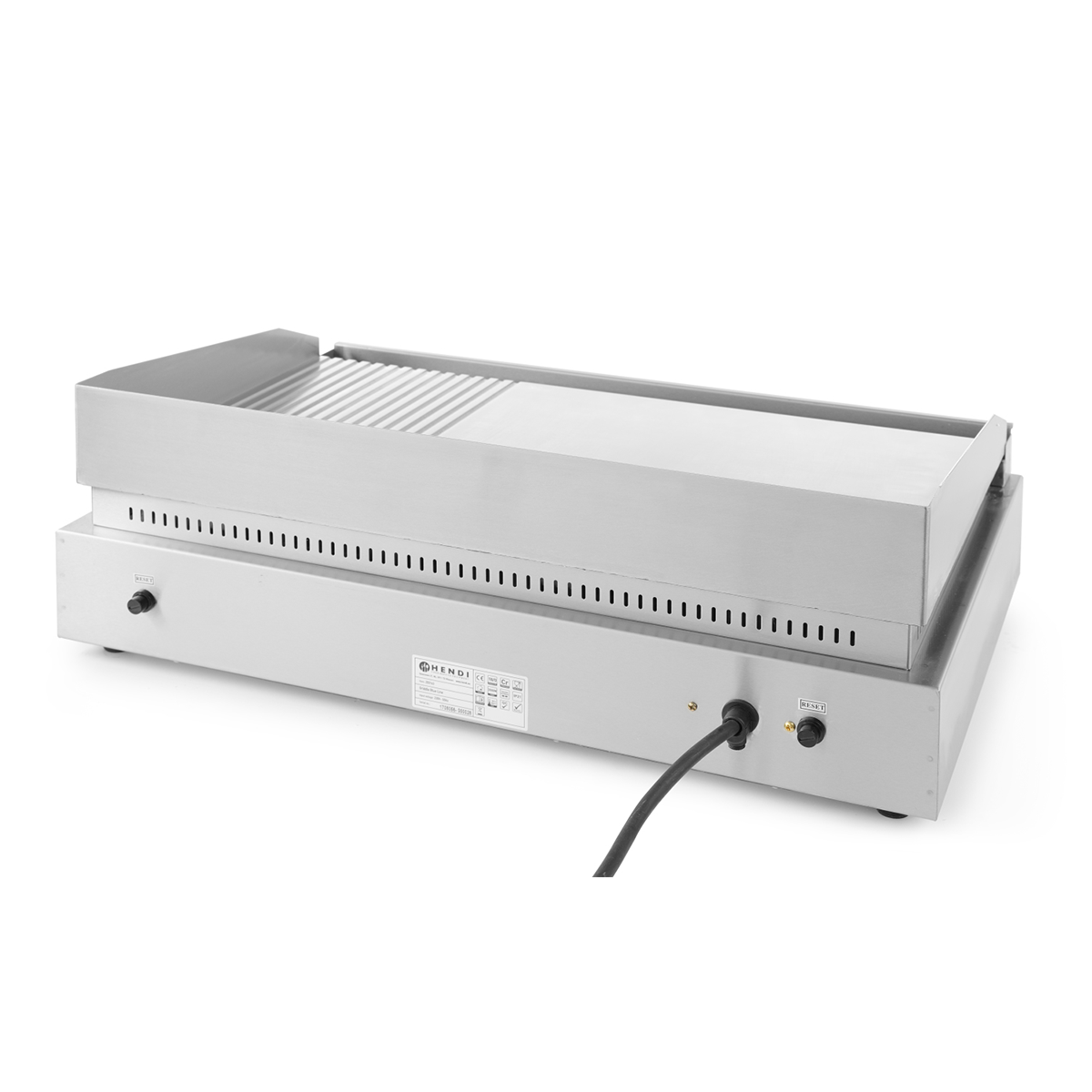 Bâti entièrement en acier inoxydable. Plaque en chromé dur (9mm) facilite le nettoyage. Avec tiroir collecteur de graisse et bords anti-éclaboussure. Température réglable en continu jusqu´à 300°C. De même, il possède une protection surchauffe. Aussi, il convient pour une utilisation continue Interrupteur avec voyant lumineux. Pieds antidérapants. 2 zones de chauffe indépendantes, 2 voyants lumineux indiquant l’échauffement. Surface grill 688×410 mm, à gauche une largeur de 462 mm lisse et à droite une largeur de 226 mm rainuré.