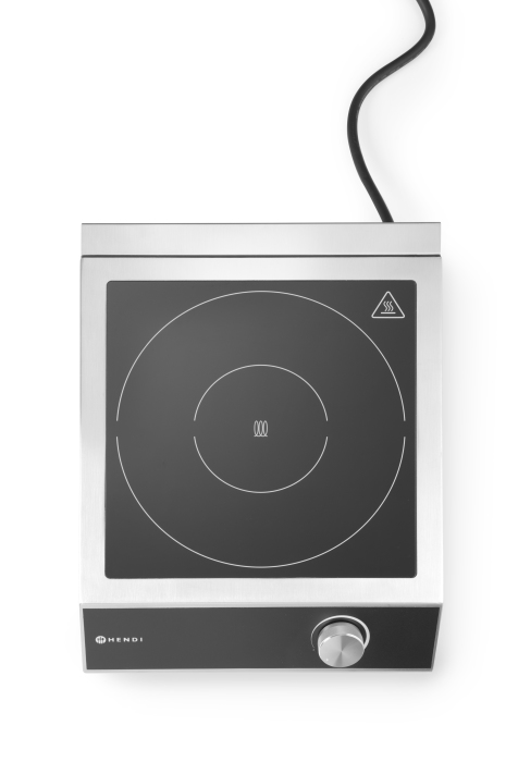 Puissance réglable en continue par un bouton. Boîtier en inox Convient pour casseroles et poêles de Ø minimum 120 mm et Ø maximum 260 mm