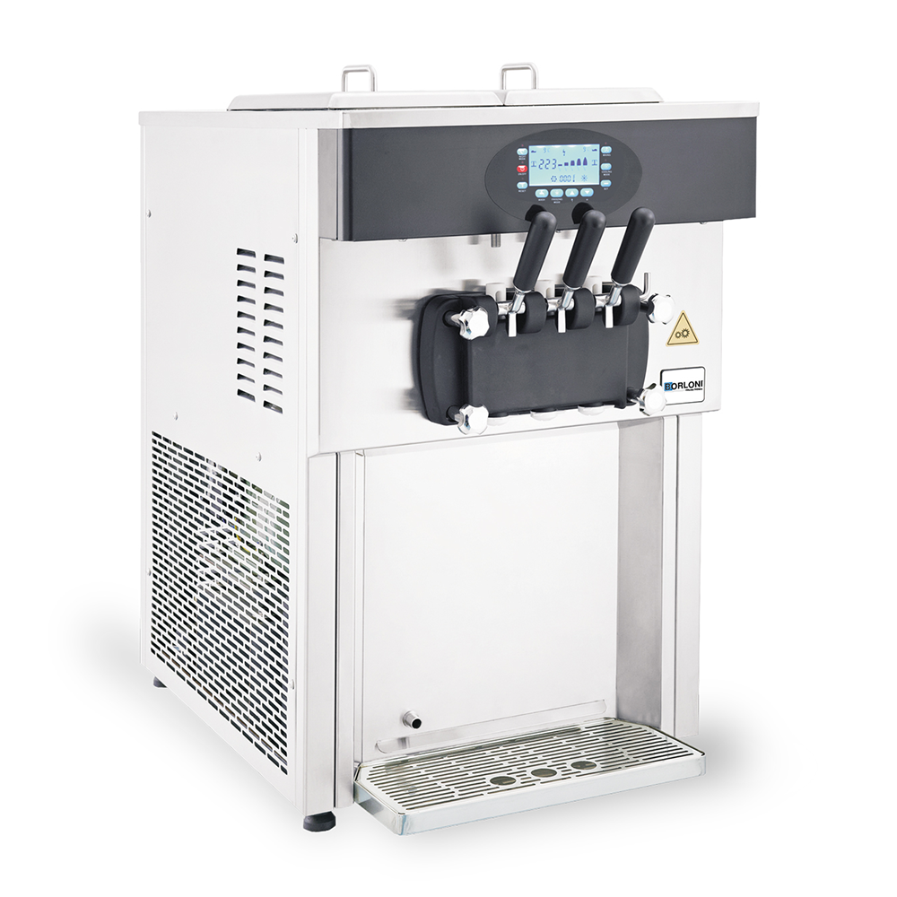 Dessin ergonomique pour la distribution de trois goûts de glace, équipée de deux réservoirs réfrigérés et d’un capteur permettant de contrôler les niveaux minimaux de mélange. Système de réfrigération à baisse consommation d’énergie. La série de machines à glace soft permet l’utilisation du mode nuit. Pendant la nuit, le mélange peut être stocké à l’intérieur du congélateur discontinu en toute sécurité hygiénique et à faible consommation d’énergie.